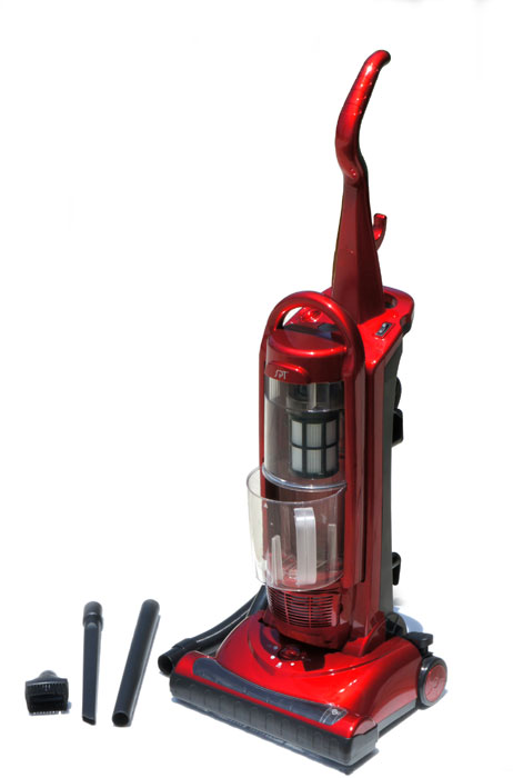 Equipped with a powerful 10 amp motor, this upright vacuum cleaner provides exceptional cleaning results and improved indoor air quality. The unit comes with a five-level carpet-height selector and a 14-inch-wide cleaning path for getting the job done quickly-especially nice when company's coming. For above-floor cleaning, the unit supplies a 3-foot stretch hose and on-board tools. The vacuum also features a HEPA filter, which effectively removes pollutants that trigger allergies and asthma, such as tobacco smoke, cat dander, dust, and pollen. Other highlights include a long 26-1/4-foot power cord, a replaceable exhaust filter, a see-through easy-to-empty dirt canister, and a carrying handle for convenient transport to and from the closet. The 1200-watt vacuum cleaner measures 15 by 15 by 42-1/2 inches and carries a one-year limited warranty. Product Description SPT bagless upright vacuum offers a strong suction power with no messy bags to clean. Features HEPA filtration to capture dust, pollen and allergen. Long 26.25ft power cord and onboard tools allow easy wall-to-wall cleaning. Dimensions: 15 x 15 x 43 inches; 20 pounds - Some assembly may be required. Please see product details.